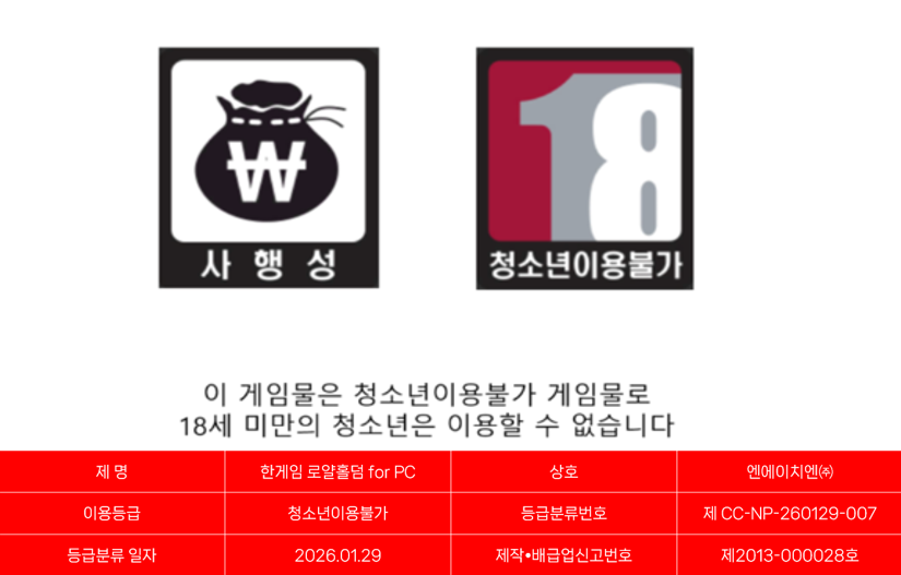 [PC 이용] 한게임 로얄홀덤 for PC의 등급분류번호는 어떻게 되나요?