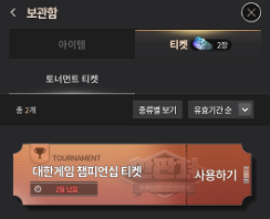 티켓을 수령하면 보관함> 티켓함에 아래와 같은 티켓이 지급됩니다.