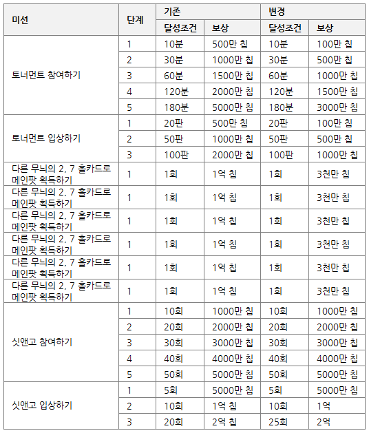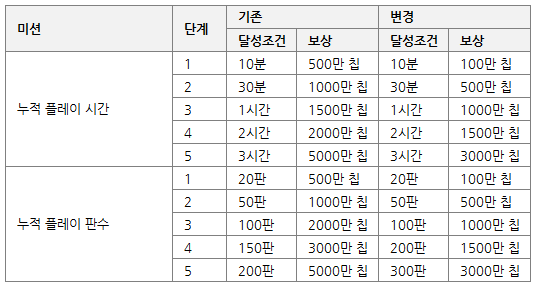 - 일일 미션과 주간 미션의 단계별 달성조건 및 보상이 변경됩니다.