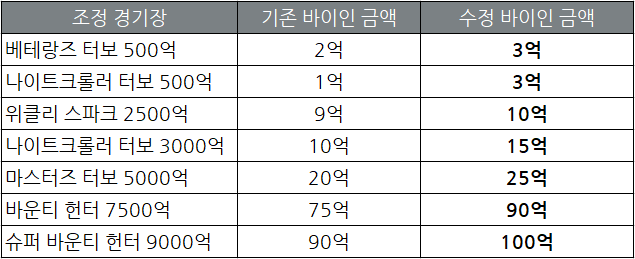 - 일부 토너먼트 경기장 바이인 금액 및 개런티 상금 조정