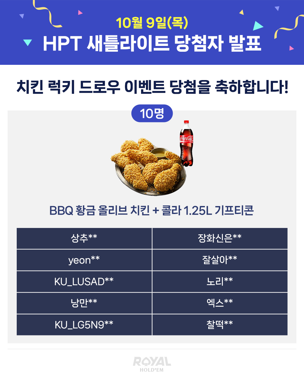 [당첨자발표] 10/9 HPT 치킨 럭키드로우 당첨자 발표
