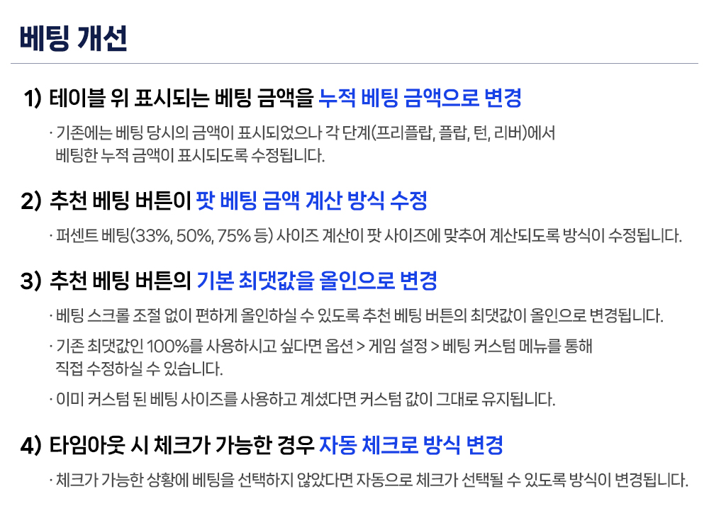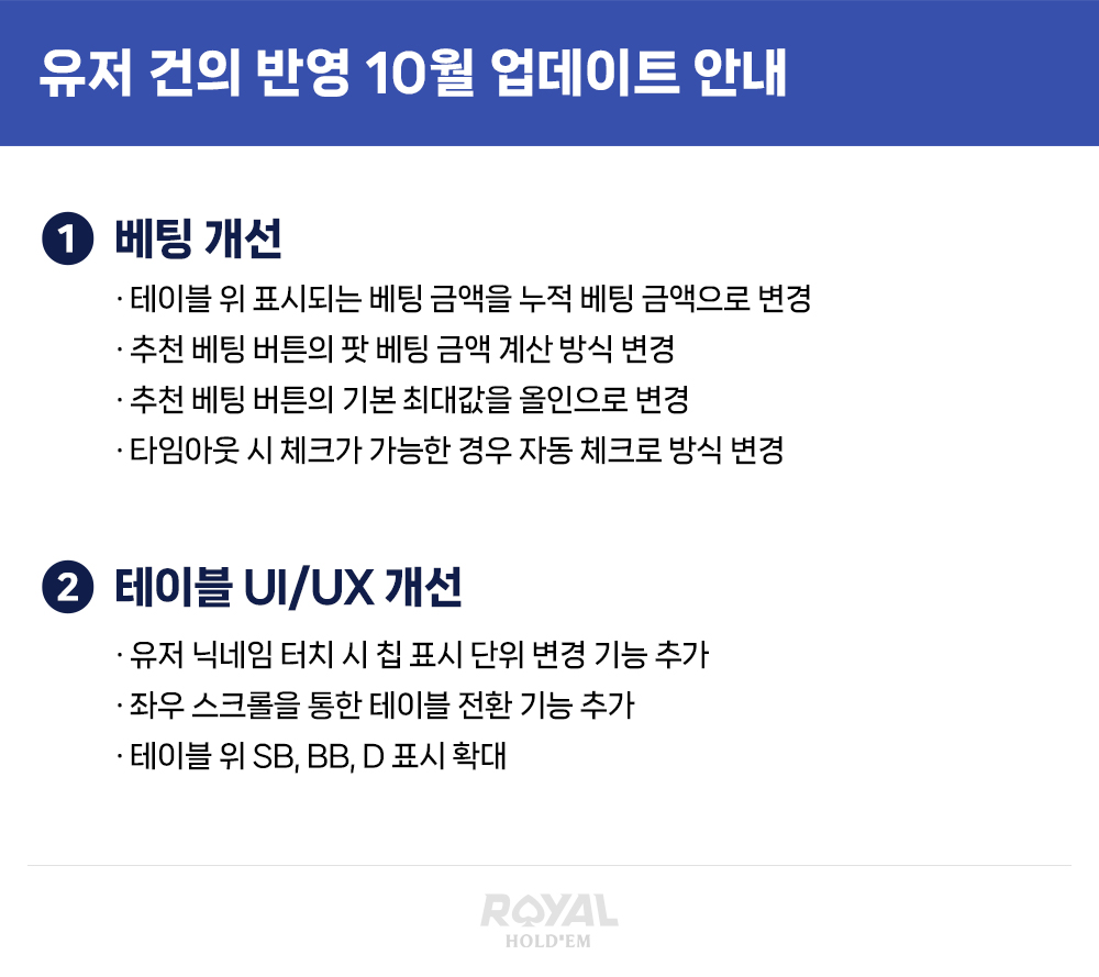 앞으로도 다양한 기능 업데이트를 통해 보내주신 사랑에 보답하는 로얄홀덤이 되어보려고 합니다.