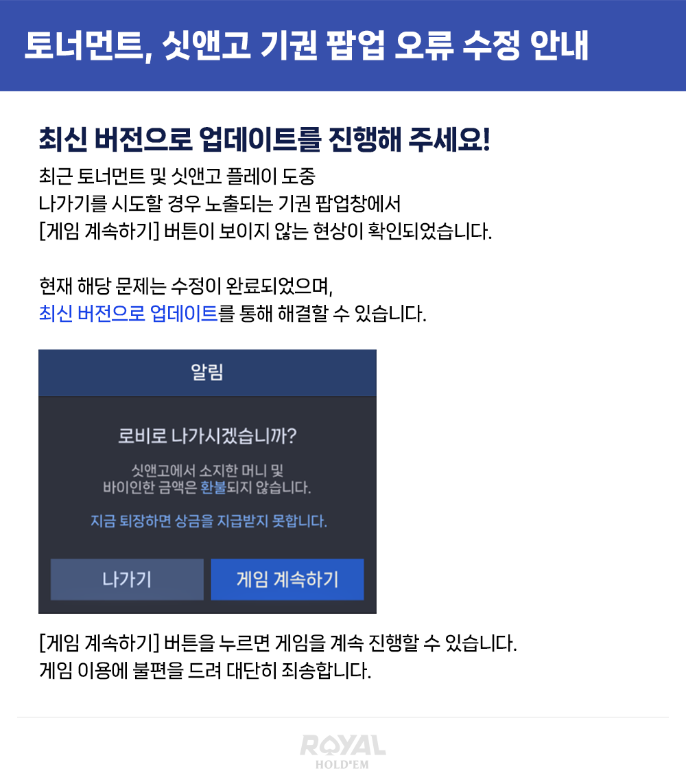 [공지] 토너먼트, 싯앤고 기권 팝업 오류 수정 완료