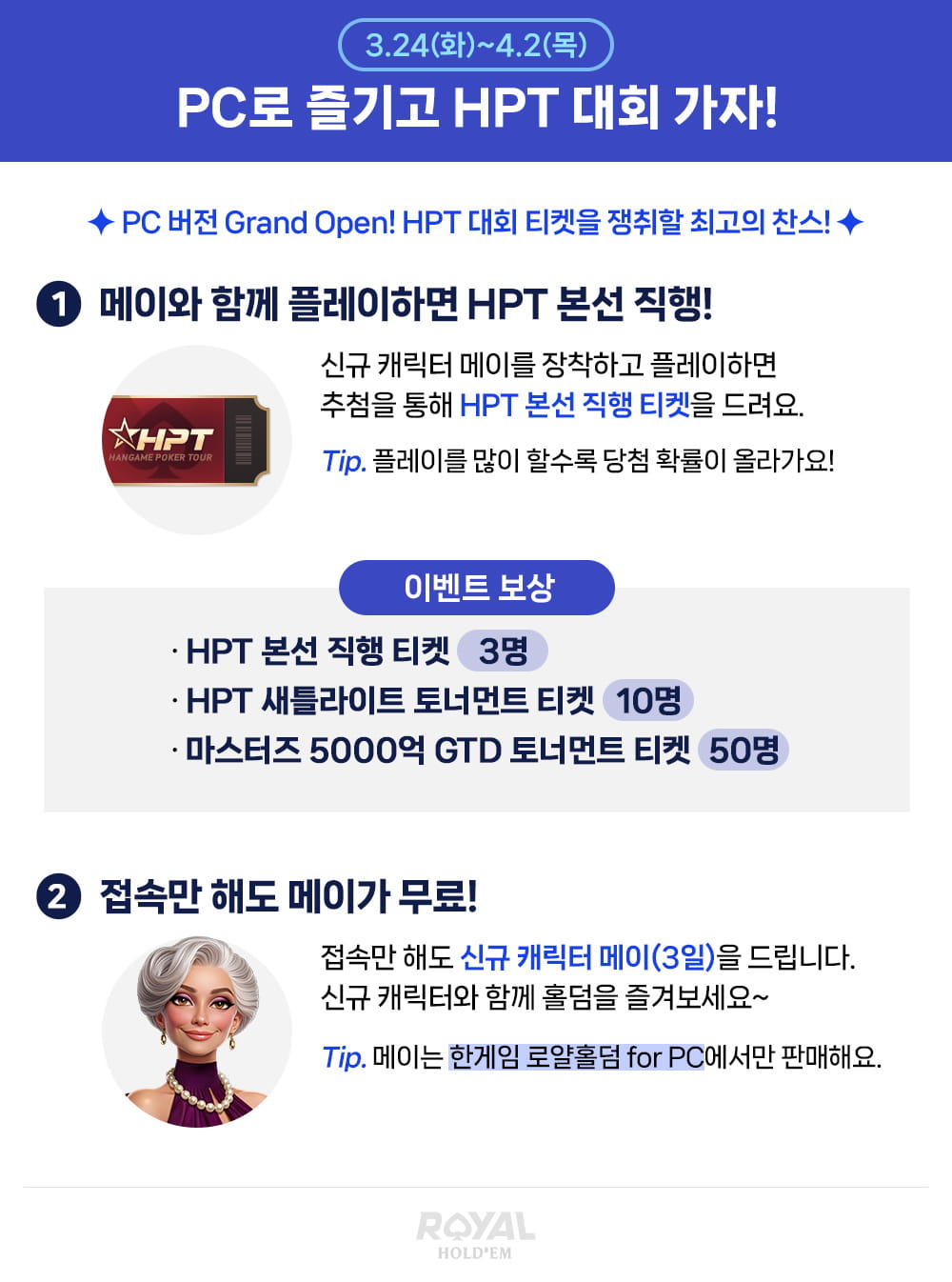 지금 바로 PC에서 플레이하고 HPT 챔피언이 될 수 있는 기회를 거머쥐세요!