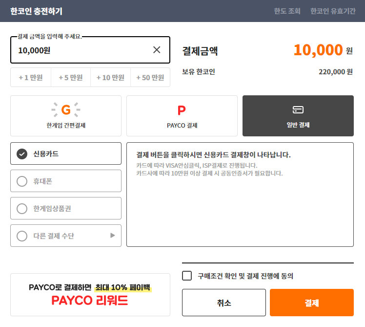 1. 한코인 충전창에서 [일반결제> 신용카드]를 선택합니다.