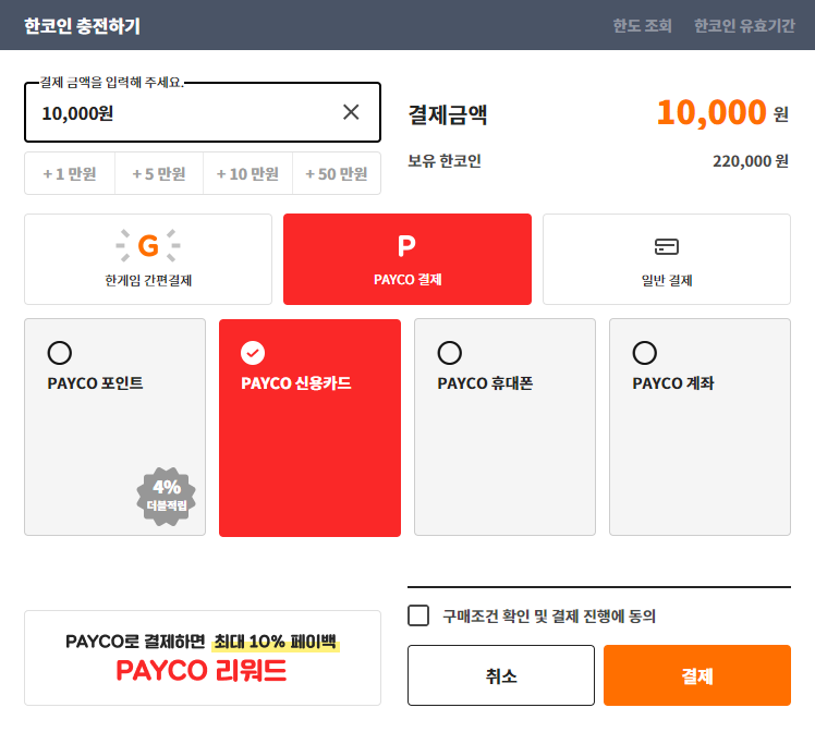 2. 한코인 충전창에서 [PAYCO 결제 > PAYCO 신용카드]를 선택합니다.
